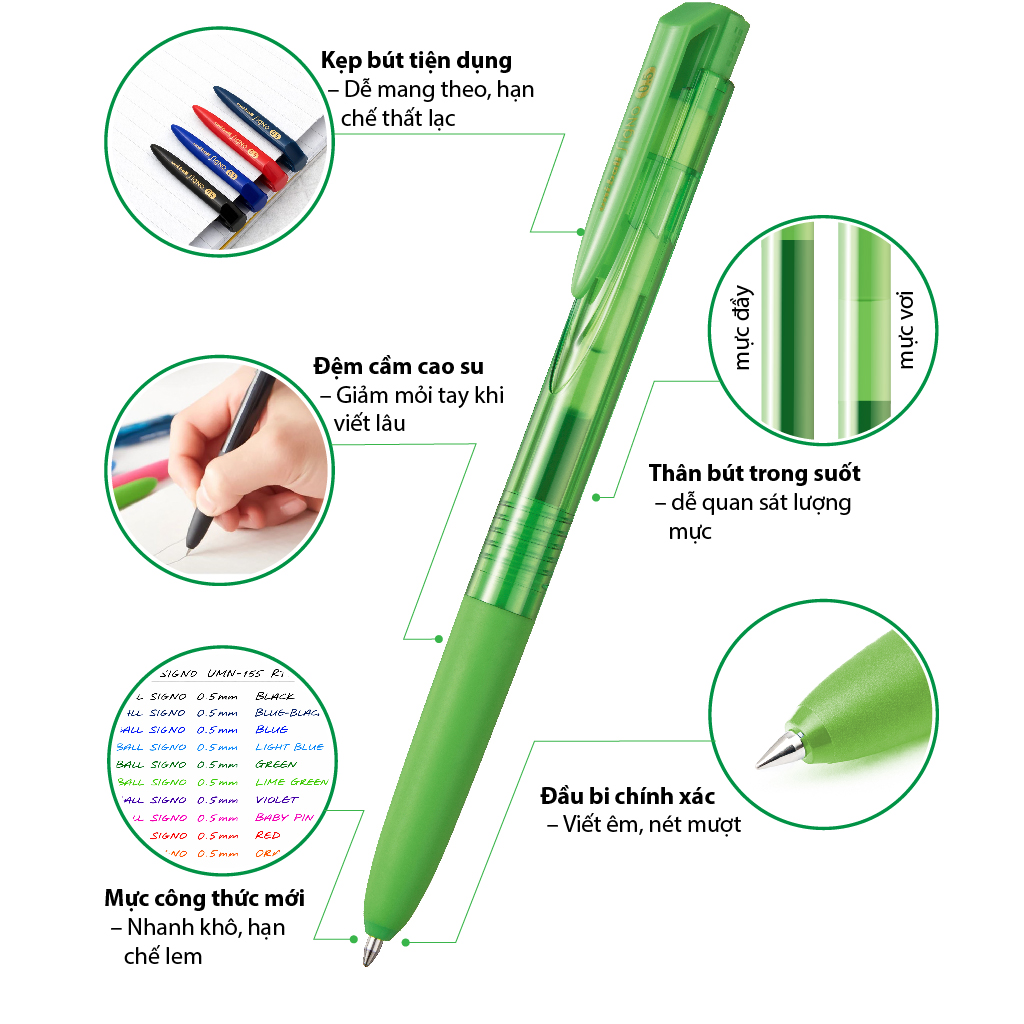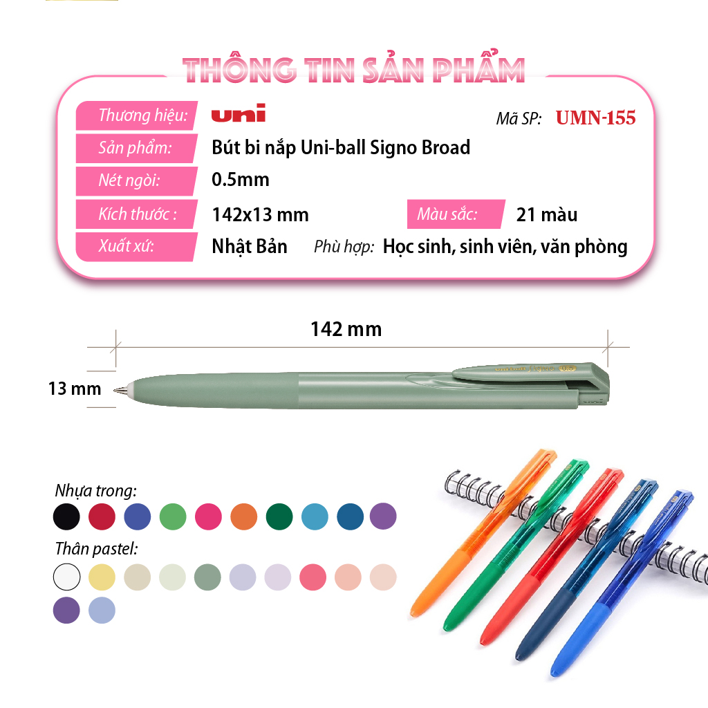Bút Uni-Ball UMN-155 là dòng bút gel đến từ thương hiệu Uni (Mitsubishi Pencil – Nhật Bản), nổi bật với chất lượng mực vượt trội, cho trải nghiệm viết mượt mà, đều mực và nhanh khô, không lem. Thiết kế dạng bấm tiện lợi, thân bút chắc chắn, hiện đại, phù hợp với nhiều đối tượng sử dụng.